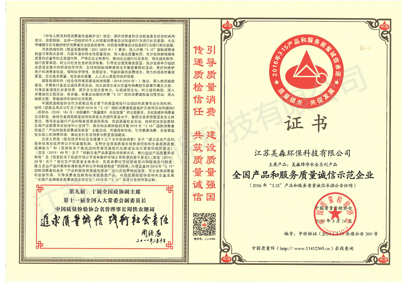 2016年全国产品和服务质量诚信示范企业-净水全系列产品